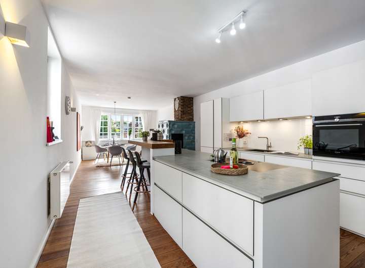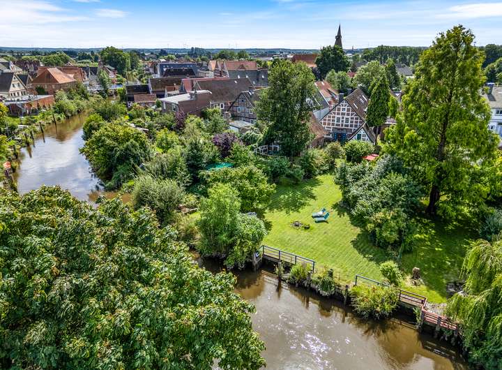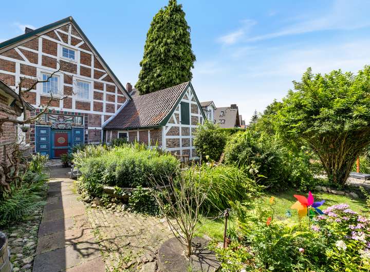 Zum Verkauf steht ein historisches Fachwerk-Ensemble aus dem Jahr 1669 in Jork-Estebrügge, umfassend kern- und fassadensaniert und unter Ensembleschutz stehend. Das Anwesen bietet ca. 360 m² Wohnfläche auf einem Grundstück von rund 1.400 m² mit direktem Zugang zur Este und eigenem Bootsanleger.
