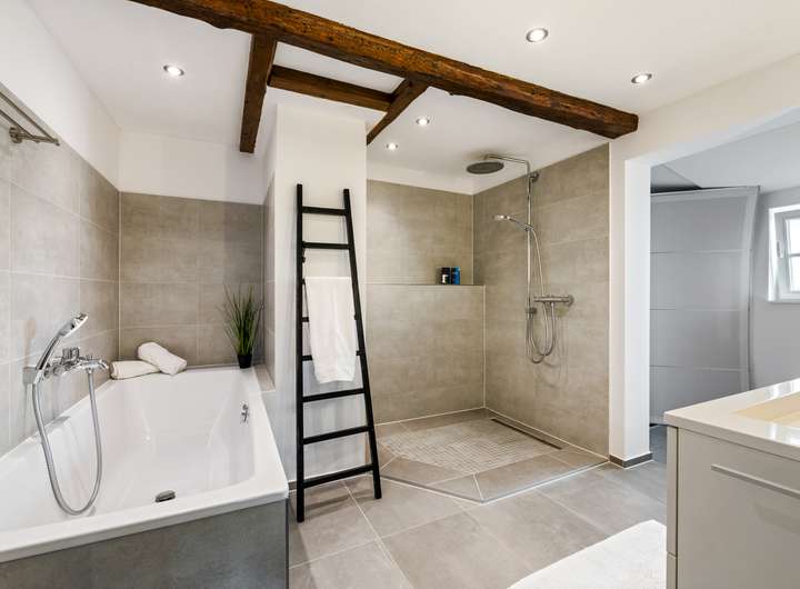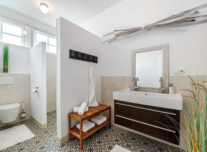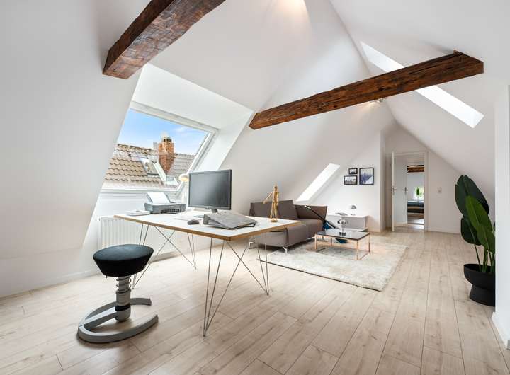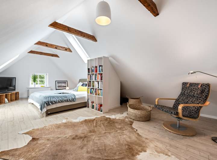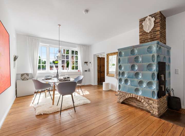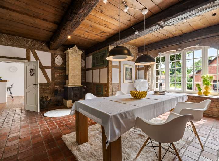 Das Hauptgebäude verfügt über 11 Zimmer einschließlich Wohnküche, Wohnzimmer, drei Schlafzimmer, flexibel nutzbare Kinder- und Arbeitszimmer, sowie insgesamt 3 Bäder. Offene Deckenbalken, Holzdielen, viele Detail-Elemente und drei funktionsfähige Kachelöfen schaffen eine besondere Wohnatmosphäre.