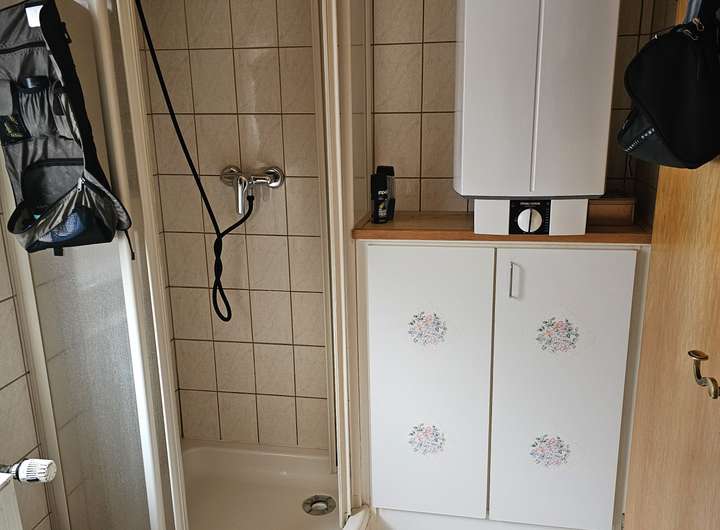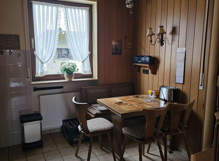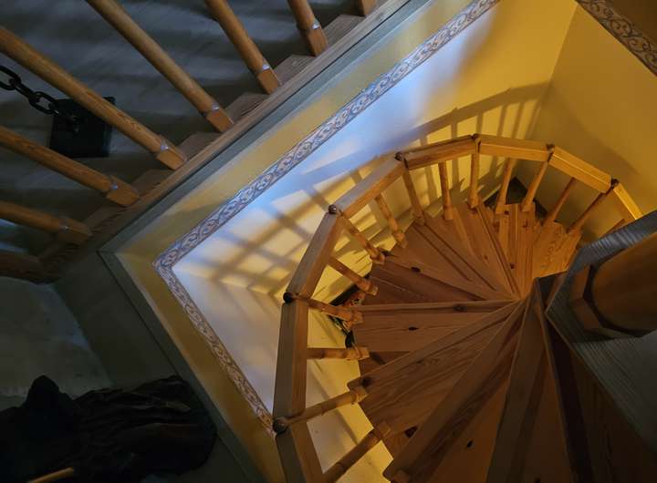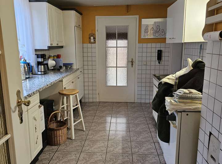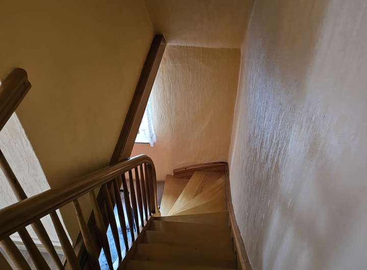 Die erste Wohnung befindet sich im älteren Gebäudeteil. Im Erdgeschoss liegen eine Waschküche und eine Werkstatt mit Zugang zum Heizöltankraum. Im Obergeschoss ist die eigentliche Wohnung: Sie besteht aus einer Küche, einem Bad mit Dusche und Wanne, einem Schlafzimmer und einem Wohnzimmer. Eine geräumige Diele mit Wendeltreppe führt zu einem beheizbaren Raum im Erdgeschoss, ideal als Hobby- oder Arbeitszimmer. Ein Balkon mit Blick in den Hof gehört ebenfalls dazu – er ist auch von der zweiten Wohnung aus zugänglich.