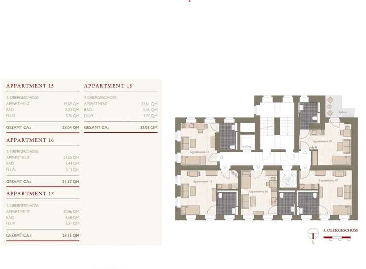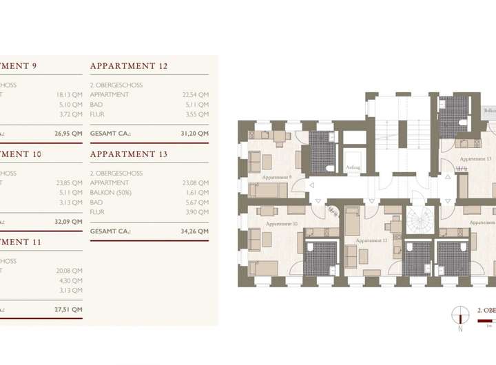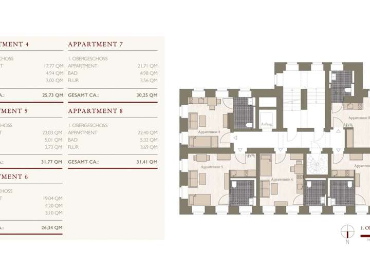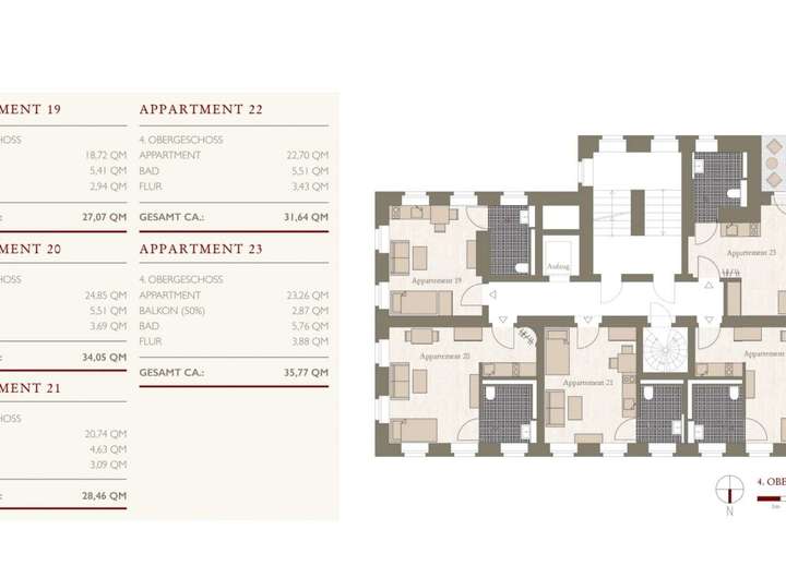 Die Apartmentgrößen liegen zwischen 24m² und 41m², so dass diese individuell nach Ihren Wünschen gestaltet werden können.