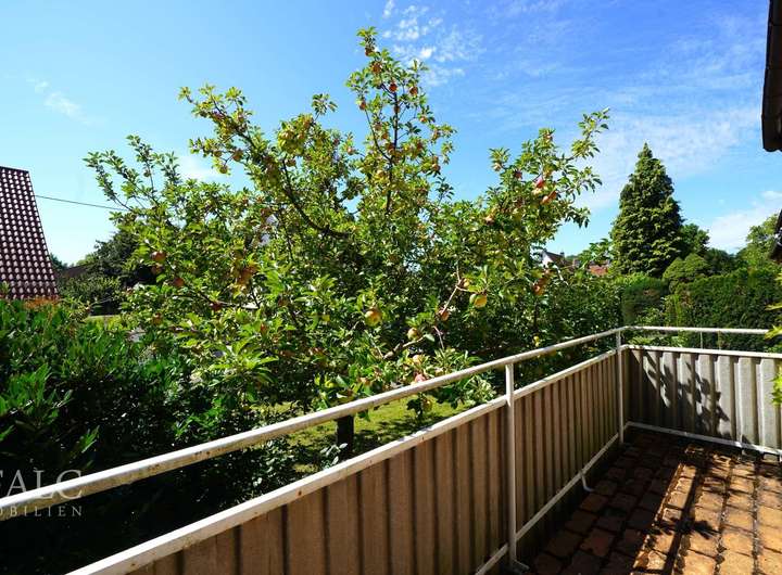 Der angrenzende Balkon, der sich zur Südseite hin öffnet, bietet einen herrlichen Rückzugsort im Freien. Hier können Sie sich zur Mittagszeit ein Sonnenbad gönnen oder den Blick über den Garten genießen, während die Sonne langsam untergeht.