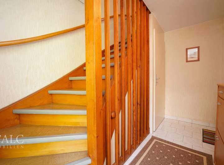 Auf der Rückseite des Hauses betreten Sie Ihr neues Zuhause durch einen einladenden Eingang, der Sie direkt in das helle und freundliche Treppenhaus führt. Bereits der erste Eindruck vermittelt ein Gefühl von Ruhe und Geborgenheit.