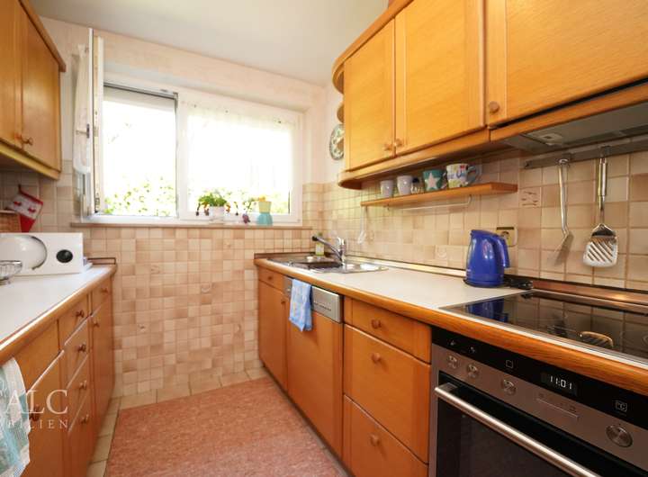 Gegenüber befindet sich die Küche, welche funktional gestaltet ist und genügend Platz bietet. Viel Stauraum sorgt dafür, dass alles seinen Platz findet und Sie jederzeit einen aufgeräumten Kochbereich genießen können.