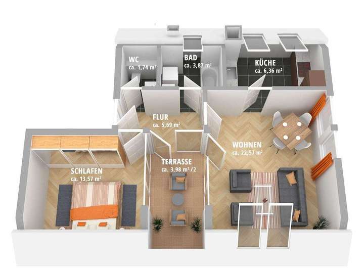 Die vielen Fenster lassen den ganzen Tag über natürliches Licht hinein und schaffen eine offene, angenehme Atmosphäre.