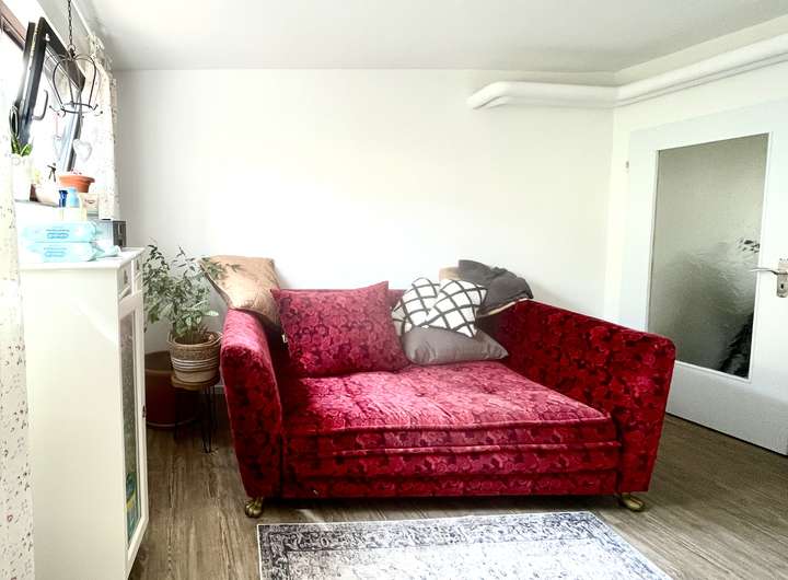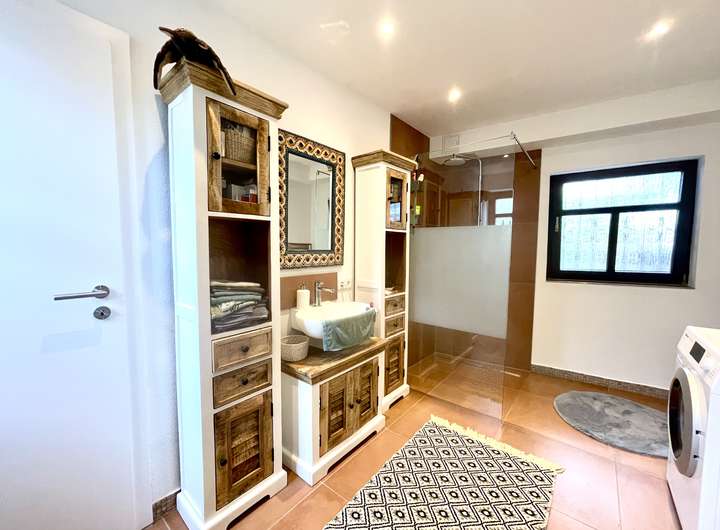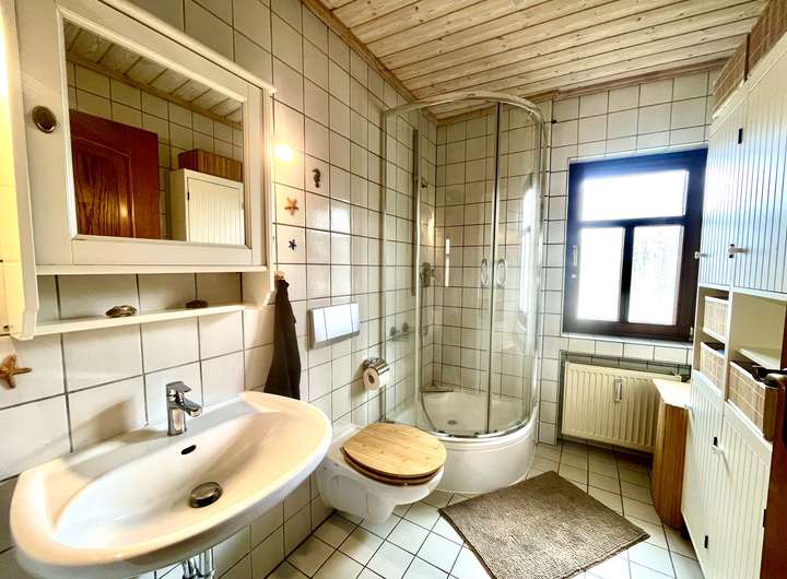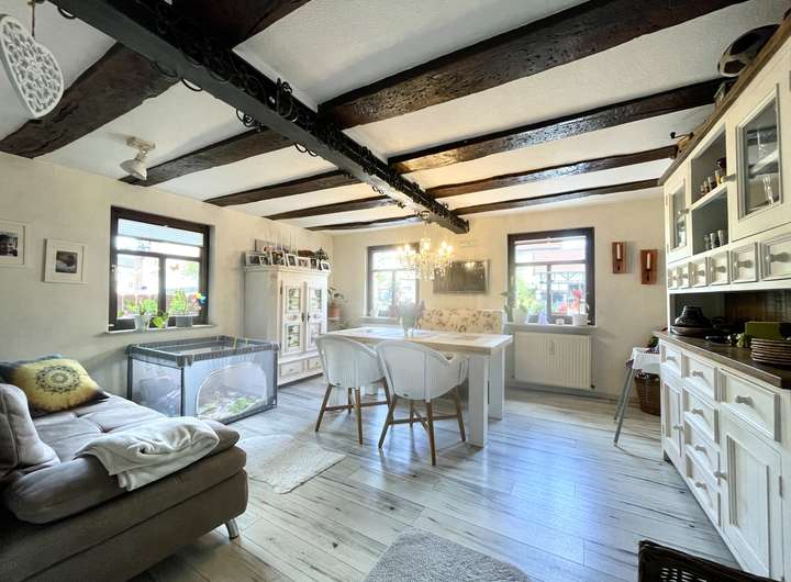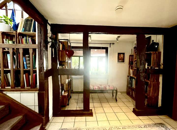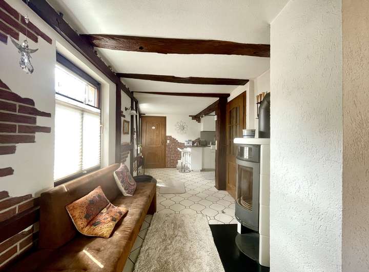 Das Erdgeschoss begrüßt Sie mit einer großzügigen Diele, die ausreichend Platz für eine große Garderobe bietet. Über einen kleinen Flur, der durch den eingebauten Kaminofen zu einem echten Blickfang wird, gelangen Sie in das gemütliche Wohnzimmer. Dieses besticht durch die offenliegenden Balken, die dem Raum einen besonderen Charme verleihen. Die neue Einbauküche überzeugt im modernen Design, zeitloser Eleganz und höchstem Komfort – hier bleiben keine Wünsche offen. Das im letzten Jahr neu gestaltete Bad führt in ein Gästezimmer, das auch als separates Büro, Kosmetikstudio oder ähnliches genutzt werden kann, da sich auf der Rückseite vom Hof ein separater Eingang befindet.