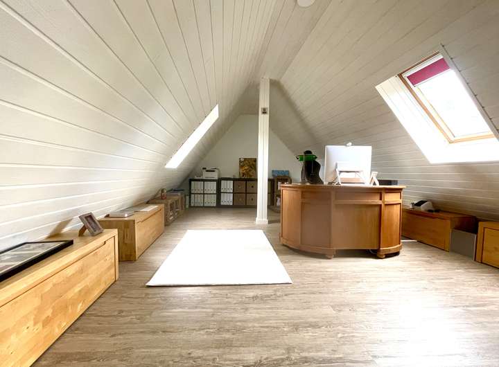 Das absolute Highlight bildet das Dachgeschoss. Ein großzügiges Dachstudio auf zwei Ebenen mit separatem Atelier bietet vielfältige Nutzungsmöglichkeiten. Von der ersten Ebene des Studios gelangen Sie auf den großen Sonnenbalkon, der zum Entspannen einlädt. Ob separater Elternbereich, Home-Office oder Rückzugsort – das Dachgeschoss lässt keine Wünsche offen und bietet Raum für individuelle Gestaltung.
