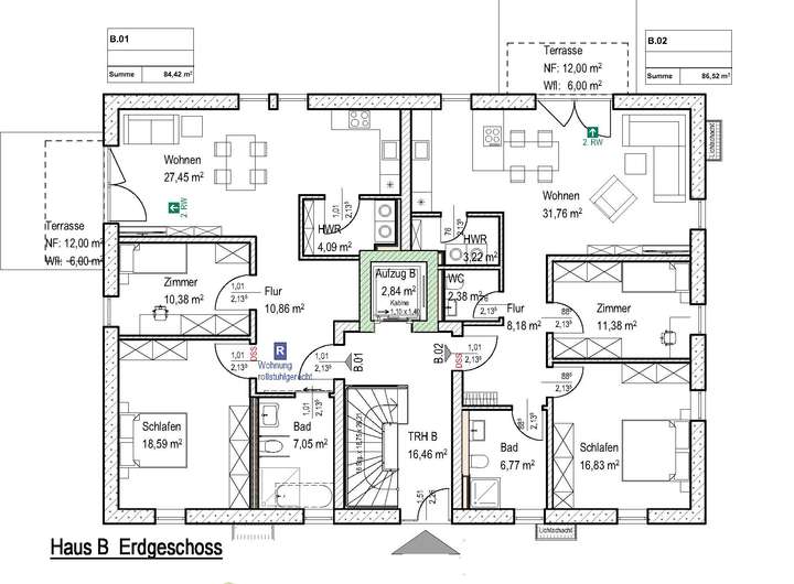 Jeweils ein zentraler Personenaufzug pro Haus, führt vom Kellergeschoss über alle Wohngeschosse bis in die Dachgeschosswohnungen und gewährleistet somit einen stufenlosen Zugang in alle Wohnungen.