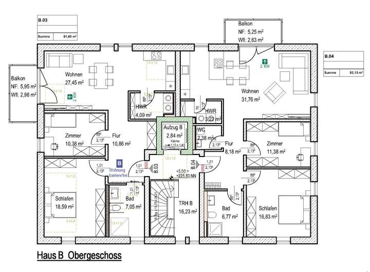 Jeweils ein zentraler Personenaufzug pro Haus, führt vom Kellergeschoss über alle Wohngeschosse bis in die Dachgeschosswohnungen und gewährleistet somit einen stufenlosen Zugang in alle Wohnungen.
