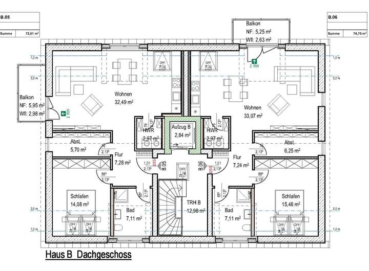 Jeweils ein zentraler Personenaufzug pro Haus, führt vom Kellergeschoss über alle Wohngeschosse bis in die Dachgeschosswohnungen und gewährleistet somit einen stufenlosen Zugang in alle Wohnungen.