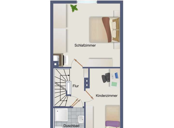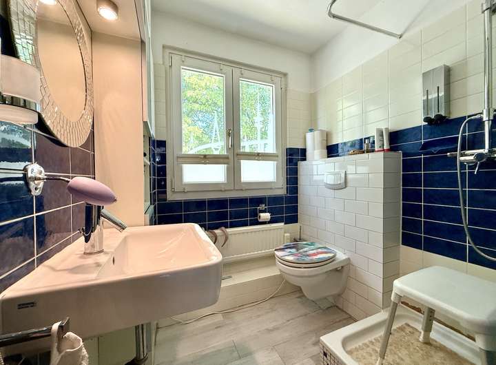 Über eine klassische Holztreppe gelangen Sie ins Obergeschoss. Hier befinden sich ein geräumiges Schlafzimmer mit Platz für einen Einbauschrank, ein weiteres Zimmer (Kinder- oder Arbeitszimmer) sowie ein Duschbad mit maritimer Fliesengestaltung, Spiegelschrank und Waschtisch.