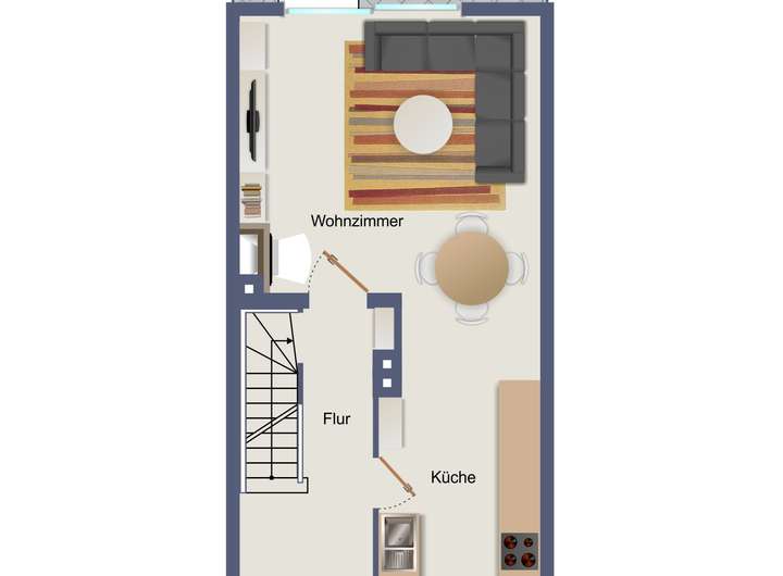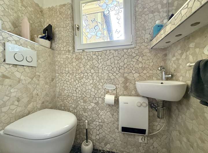 Im Erdgeschoss erwartet Sie ein großzügiger Wohn- und Essbereich mit Zugang zur überdachten Terrasse und Blick in den grünen Garten. Die offen gestaltete, zeitlose Einbauküche (Baujahr 2015) fügt sich harmonisch ein. Ein hell gestalteter Windfang mit angrenzendem Gäste-WC im mediterranen Stil sowie der dahinterliegende Flur, von dem aus Obergeschoss und Keller erreichbar sind, komplettieren diese Ebene.