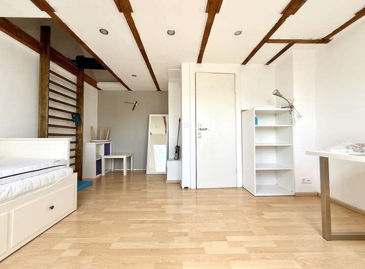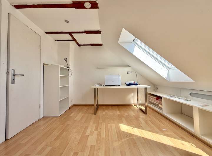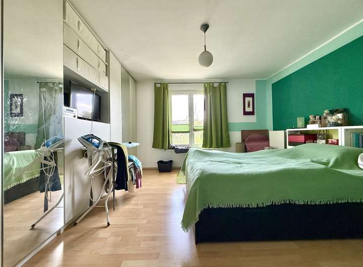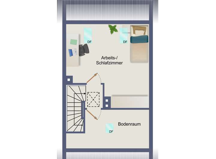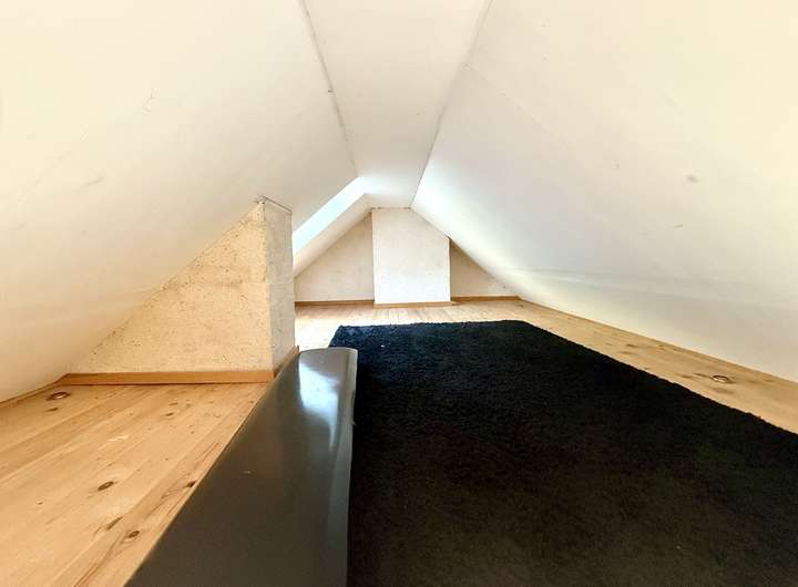 Das 2010 ausgebaute Dachgeschoss bietet auf ca. 13 m² ein großzügiges Schlaf- und Arbeitszimmer mit hellen Wandflächen und Laminatboden. Praktische Velux-Fenster sorgen für eine freundliche Atmosphäre. Zusätzlich wurde der Spitzboden mit Boden-Spots ausgebaut. Ein weiterer kleiner Bodenraum dient als Abstellfläche oder Ausbaureserve, beispielsweise für ein kleines Badezimmer.