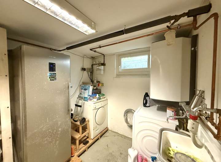 Der Vollkeller erweitert das Flächenangebot und bietet vielseitige Nutzungsmöglichkeiten. Hier stehen ein Waschmaschinen- und Trocknerbereich sowie ein weiterer heller Raum zur Verfügung, der sich hervorragend als Gäste- oder Hobbyzimmer eignet.