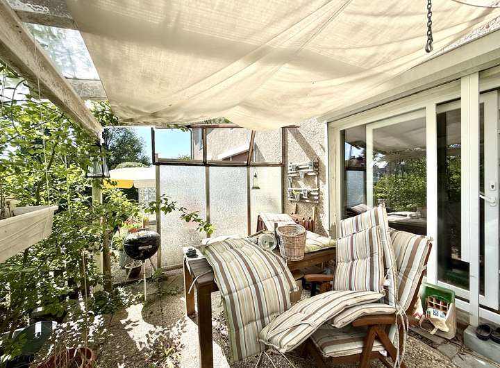 Besonders hervorzuheben ist die großzügige, überdachte Terrasse mit angrenzendem Garten. Durch die besondere Grundstücksform (L-Form) besteht die Möglichkeit, am Ende des Grundstücks, wie bei den Nachbarn, einen Carport zu errichten (nach Stellung eines Bauantrags), von dem aus Sie direkten Zugang zum Haus hätten. Zusätzlich ist ausreichend Platz für ein Gartenhaus vorhanden.