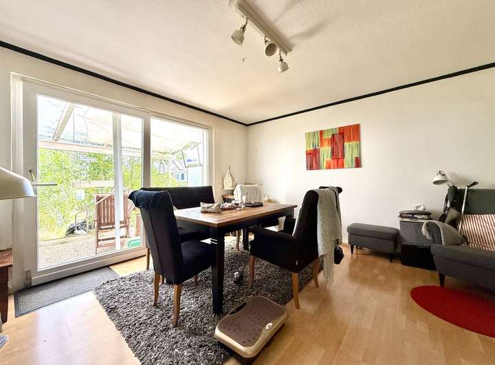 Die weißen, isolierverglasten Fenster wurden 2010 erneuert. Das große Schiebeelement zum Garten ist zusätzlich mit einem elektrischen Außenrollladen (älteres Modell) ausgestattet.