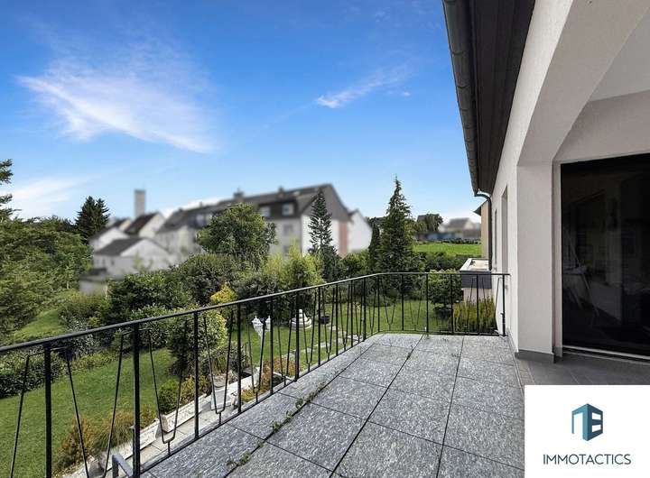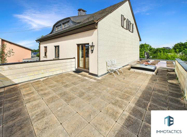 Ein besonderes Highlight ist die großzügige Dachterrasse die sich über Garage und Anbau erstreckt. Hier lässt sich der Tag ausklingen – mit Blick auf die untergehende Sonne, bei einem Glas Wein oder mit den Kindern unter freiem Himmel.
