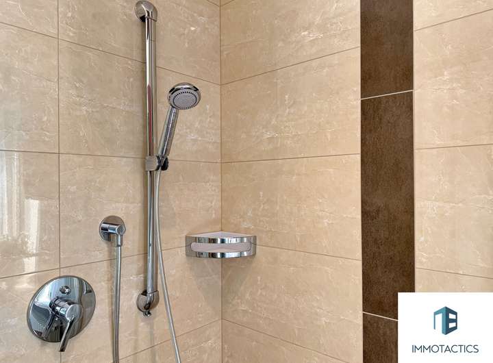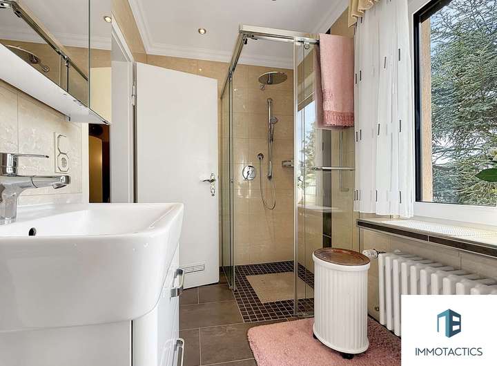 Oben angekommen, warten persönliche Wohlfühlzonen. Ein großzügiges Elternschlafzimmer, drei weitere Zimmer – ideal für Kinder, Gäste oder das Homeoffice – und das Tageslichtbad, das 2017 hochwertig modernisiert wurde. Wanne und Dusche, klare Linien, zeitloses Design.