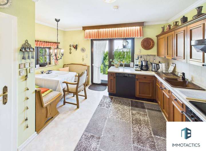 In der Küche mit angrenzender Speisekammer bleiben Arbeitswege kurz. Die angrenzende Terrasse erweitert das Familienleben in die Natur – Frühstück mit Blick ins Grüne garantiert.