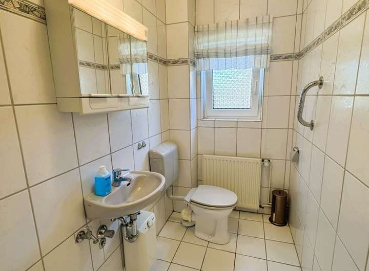 Ein geräumiges Tageslicht-Gäste-WC rundet das Raumangebot im EG ab. Es ist zeitlos in Weiß gefliest.