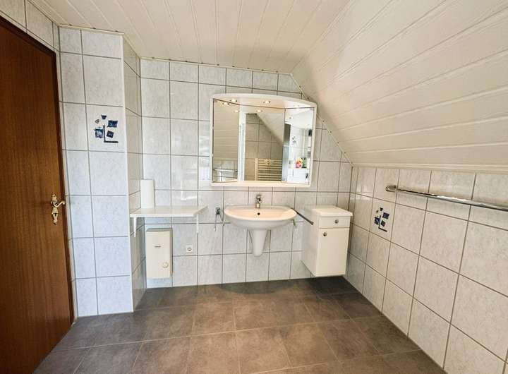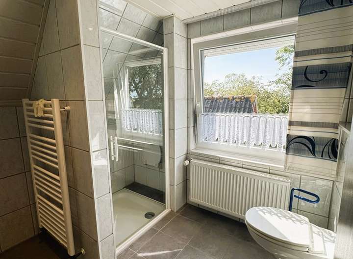 Eine Tür weiter finden Sie das geräumige Tageslicht-Badezimmer. Es wurde 2023 saniert und ist mit einer bodengleichen Dusche und Handtuch-Heizkörper ausgestattet. Fußbodenheizung ermöglicht eine schöne und gleichmäßige Wärme. Das Fenster hier datiert aus 2018.