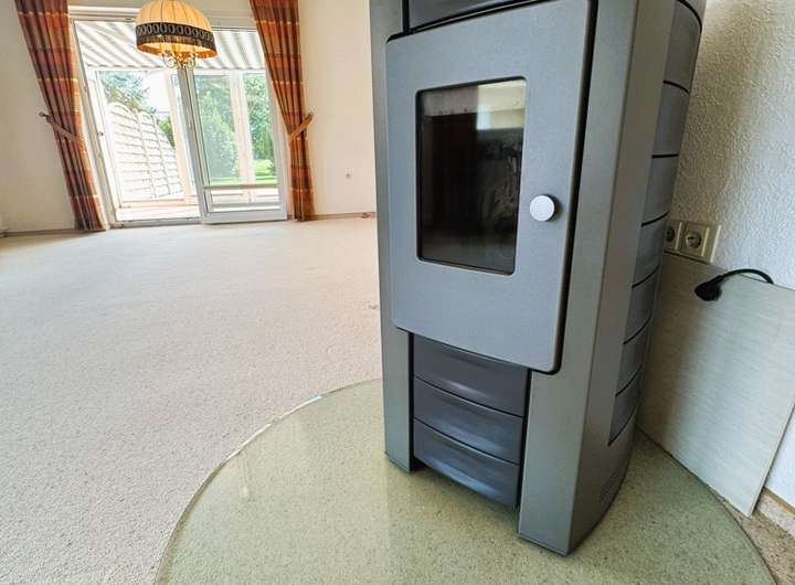 Der Boden ist mit Teppich ausgelegt. Der Pelletofen hat hier den perfekten Standort für gemütliche Stunden an kälteren Tagen.
