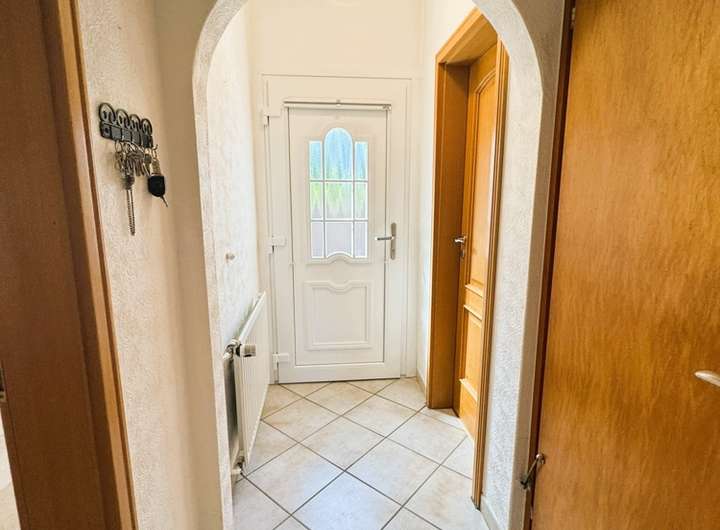 Es begrüßt Sie eine neue Haustür mit Wärmeschutzverglasung. Dahinter befindet sich der freundliche Flur, der mit hübschen und pflegeleichten Fliesen ausgestattet ist.