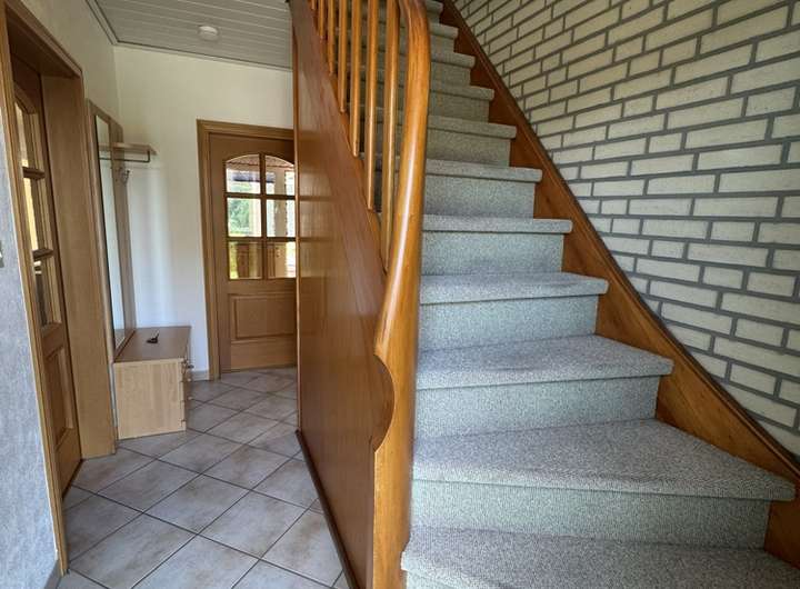 Das Obergeschoss erreicht man über eine Holztreppe. Der Flur im OG ist mit Teppich ausgelegt. 2 Schlafzimmer, 1 Bad und 1 Abstellraum (ideal auch als Büro nutzbar) finden Sie hier vor.