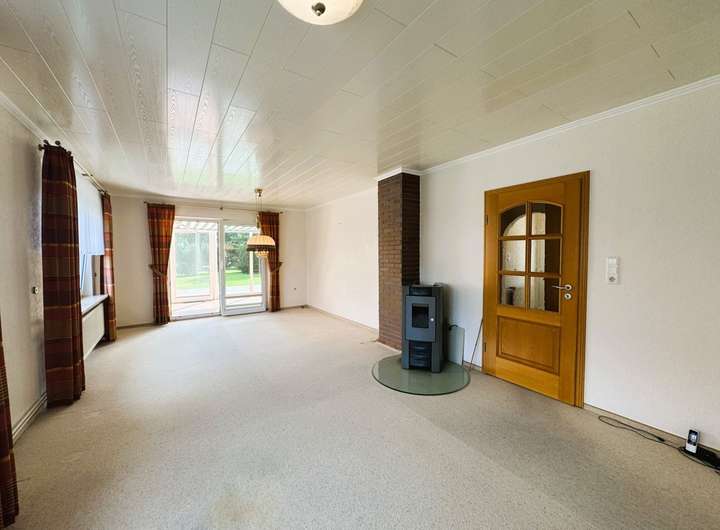Wohn-/Esszimmer mit Ofen und Zugang Wintergarten