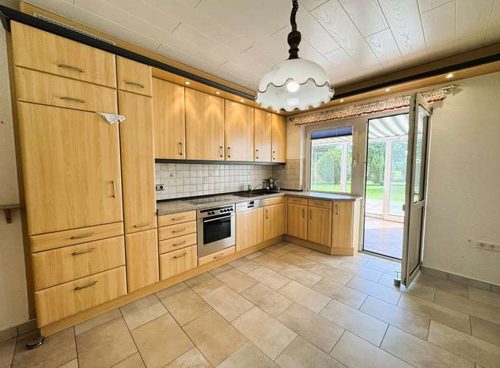Einen Raum weiter ist die freundliche Wohnküche untergebracht. Auch von hier hat man einen direkten Zugang in den Wintergarten und somit auch auf die Süd-Ost-Terrasse und den Garten. Perfekt, wenn man Mahlzeiten im Freien einnehmen möchten.