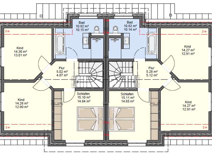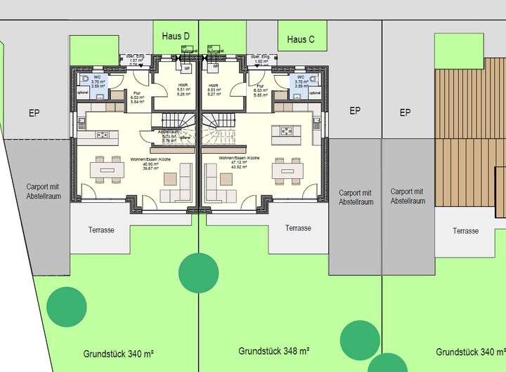 Unsere vier Doppelhaushälften bestehen aus je ca. 127 m² Grundfläche zzgl. ca. 29 m² Studio und einer jeweiligen Grundstücksfläche von ca. 327 bis 348 m² Fläche.