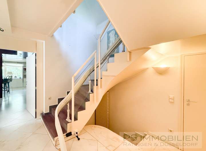 Das Haus liegt in einer ruhigen Straße in einem sehr begehrten Teil von Hösel. Die Nachbarschaft ist geprägt von großen Einfamilienhäusern und grenzt nur eine Straße weiter an eine Pferdekoppel und Wald & Wiesen, die zum Wandern, Joggen und Fahrradfahren einladen.