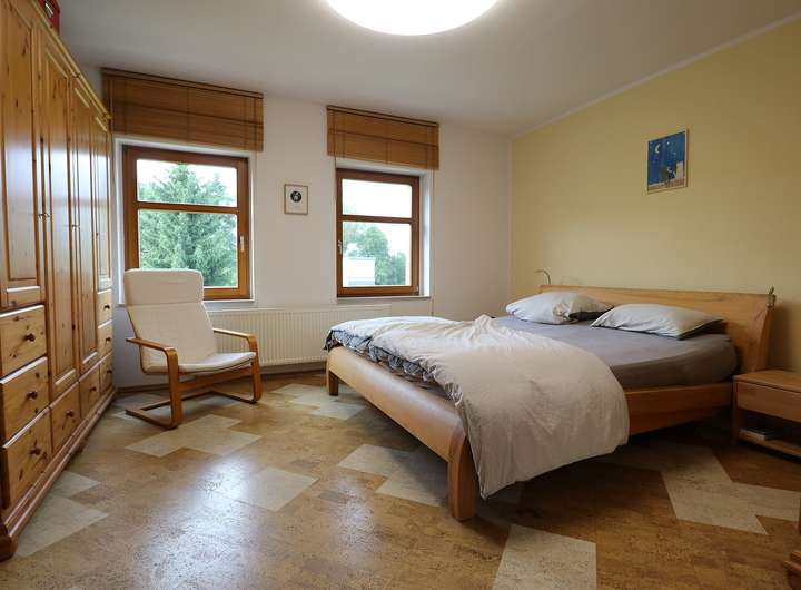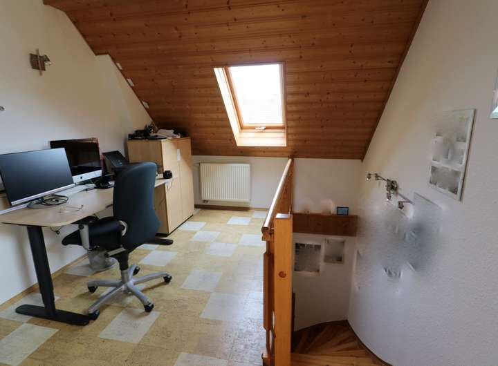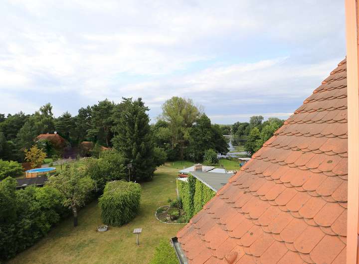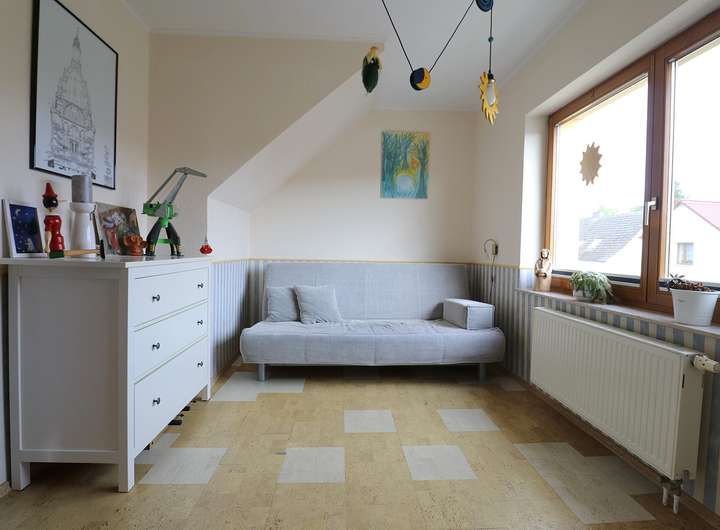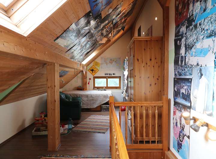 Im Obergeschoss befinden sich eine offene Galerie mit Platz für einen Schreibtisch, ein Kinderzimmer, das großzügige Schlafzimmer sowie das Wohlfühlbad der Familie. Das Bad ist mit Badewanne, Dusche, WC und zwei Waschtischen ausgestattet. Der warme Korkfußboden in den Wohnräumen des Obergeschosses sorgt für eine behagliche Atmosphäre. Zum ausgebauten Spitzboden gelangen Sie über eine Holztreppe. Dieser Wohnbereich wurde für das große Kind der Familie ausgebaut und besitzt ebenfalls einen ganz eigenen Charme. Von hier haben Sie einen tollen Blick auf den Friedrich-Wilhelm-Kanal.