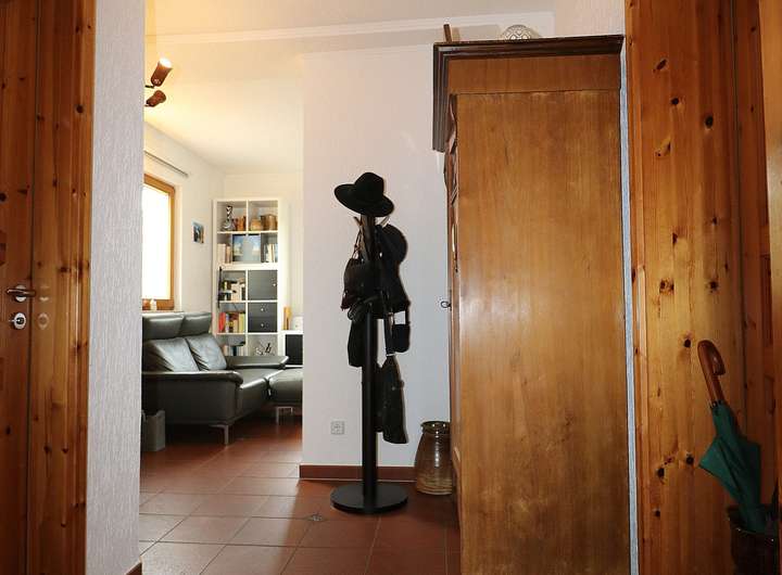 Im Erdgeschoss gelangen Sie vom Hauseingang in den Flur des Hauses. Die Terracotta Fliesen in Verbindung mit den Holztüren und den weißen Innenwänden verleihen dem Erdgeschoss eine warme und mediterrane Atmosphäre. Vom aus Flur erreichen das separate Gäste-WC, das Kaminzimmer, die Wohn- und Essküche sowie das Wohnzimmer. Auf die Gartenterrasse gelangen Sie von der geräumigen Wohn- und Essküche mit bodentiefen Fenstern. Von der Küche und der Terrasse haben Sie einen fantastischen Blick ins Grüne, Ihren eigenen Garten. Über eine kleine Holztreppe können Sie direkt das Gartengrundstück betreten.