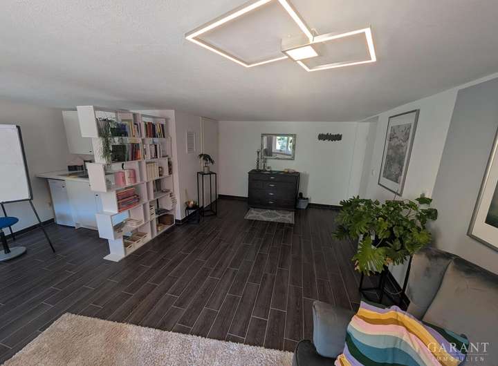 Im 1.OG erwarten Sie zwei Wohneinheiten: eine kompakte 1 Zimmer-Wohnung (ca. 30 qm) mit Dusche und WC sowie eine großzügige 5 Zimmer-Wohnung (ca. 130 qm) mit Tageslichtbad, Gäste-WC, Freisitz und einer weitläufigen Sonnenterrasse.