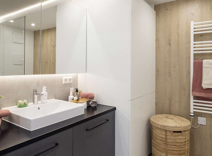- Designbäder mit bodenebener Dusche und maßgefertigten Badmöbeln
