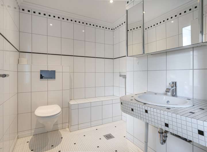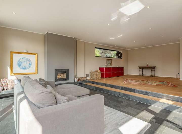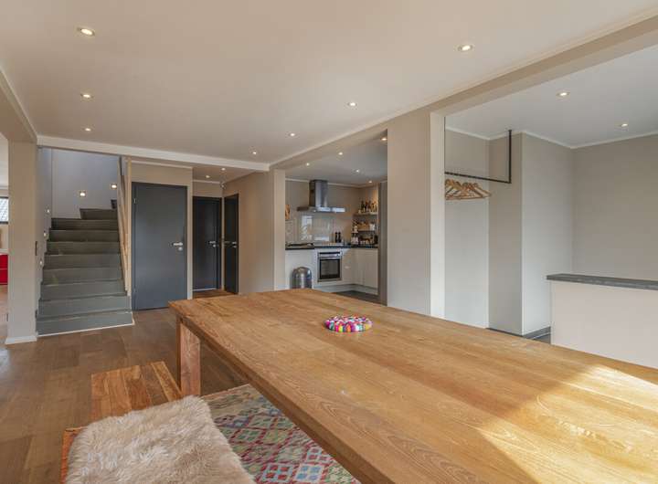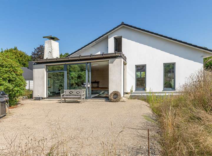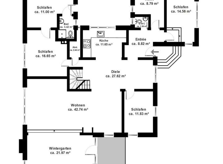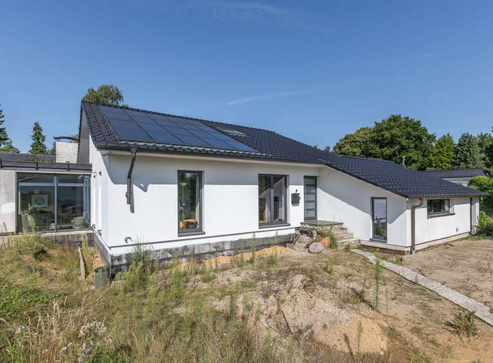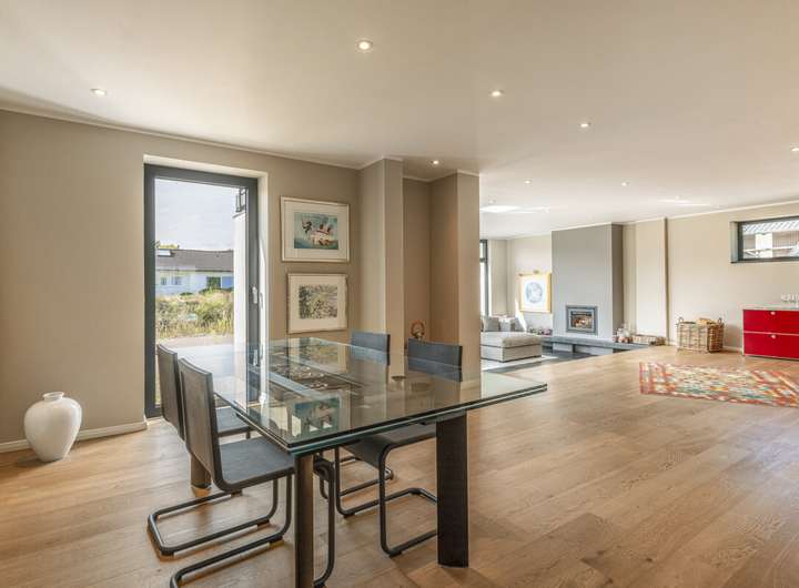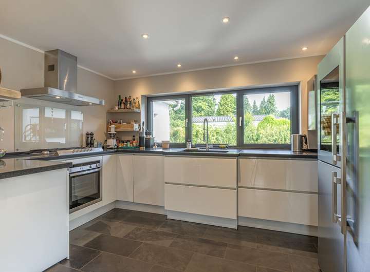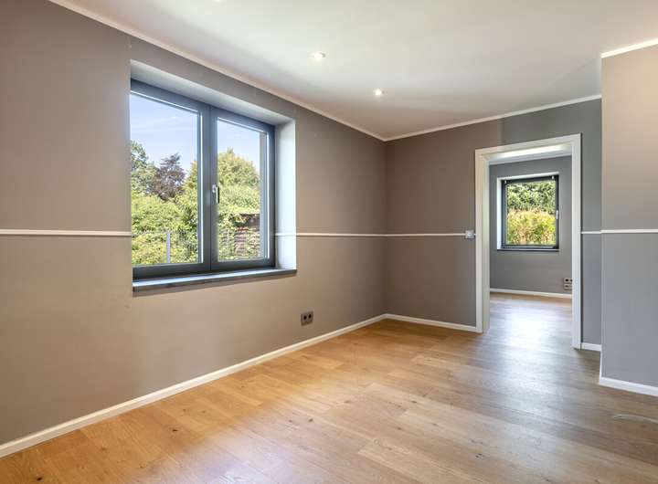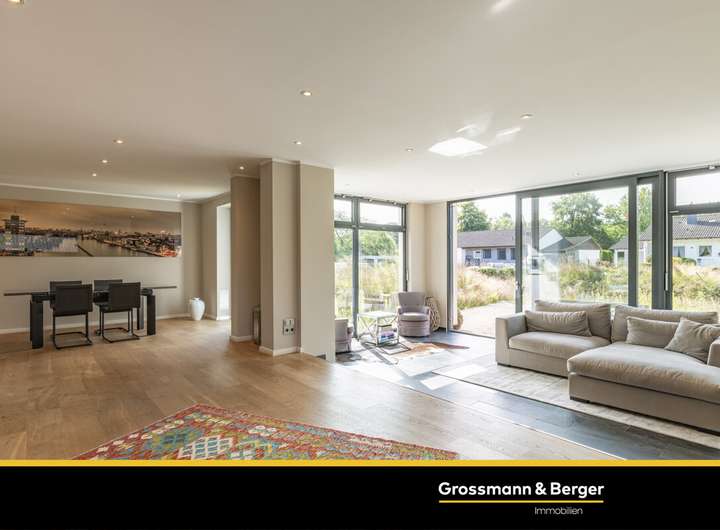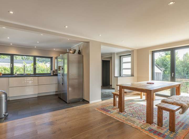 Der großzügig geschnittene Grundriss bietet seinen Bewohnern im Erdgeschoss u.a. eine geräumige Diele, einen ca. 43 m² großen Wohnbereich mit einem anschließenden, ca. 22 m² großen Wintergarten, vier Schlafzimmer, ein Duschbad en Suite, eine offene Küche, ein Gäste-WC und einen Hauswirtschaftsraum. Durch die zahlreichen, teils bodentiefen Fenster wird das Haus von viel Tageslicht durchströmt. Vor dem Kamin im Wintergarten lassen sich behagliche Stunden verbringen. Komplettiert wird das Raumangebot auf dieser Ebene von einem Heizungsraum und einem Abstellraum, die jeweils von außen zugänglich sind. Zwei Schlafzimmer und das Duschbad ließen sich zu einer Einliegerwohnung mit separatem Außenzugang abtrennen.