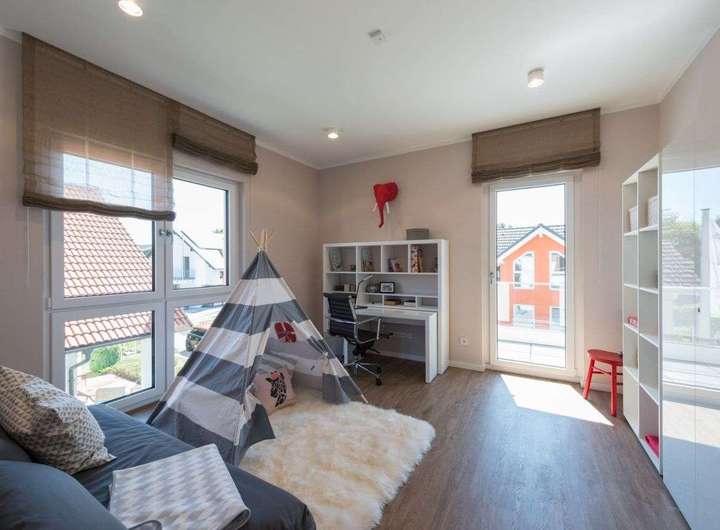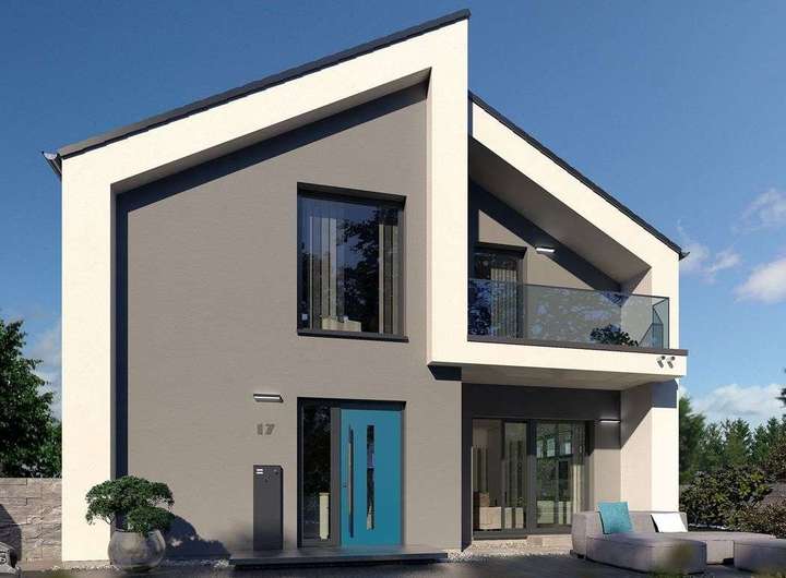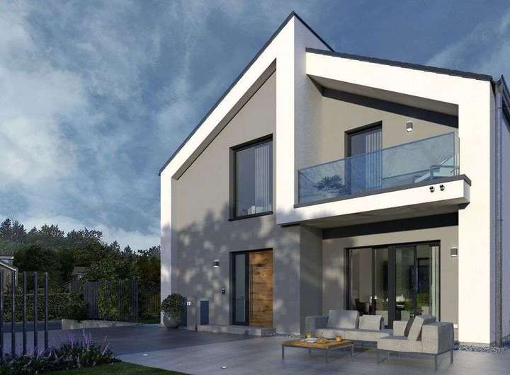 Schon von außen ein echtes Highlight! Die Fassade besticht durch ihre moderne, durchdachte und außergewöhnliche Architektur. Durch den besonderen Grundriss mit einem eingerückten Bereich entstehen sowohl auf der Vorder- als auch auf der Rückseite zwei windgeschützte Terrassenbereiche. Extravaganz und Eleganz in Vollendung. Das trifft auch auf das Innere zu: Hier überzeugt die durchdachte Raumaufteilung ebenso wie der großzügige Schnitt mit einem großen Wohn-Koch-Bereich und sich anschließendem Wohnzimmer. Komplettiert wird das Erdgeschoss durch einen Hauswirtschaftsraum sowie ein Gäste-WC. Über die zentral gelegene Treppe erreicht man das Obergeschoss mit Galerie, Elternschlafzimmer, einem großen Badezimmer mit Badewanne und Dusche sowie zwei Kinderzimmern. Ein absolutes Highlight: der große Balkon mit edlem Glasgeländer.
