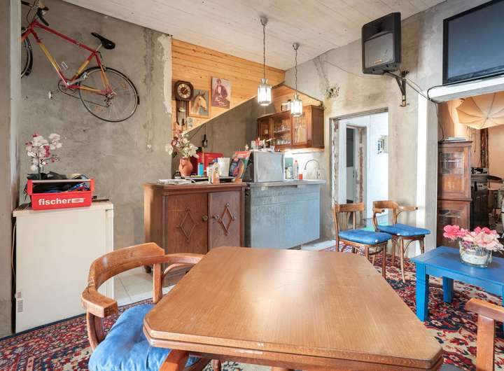 Das Erdgeschoss war früher Gastronomie. Hier wurde gelacht, gegessen und wahrscheinlich auch mal über den Durst getrunken. Heute ist es Ihr großzügiger Eingangsbereich mit Platz für alles – vom Atelier bis zur heimischen Minibar. Zwei WCs aus der guten alten Gastrowelt sind auch noch da. Die sind so charmant, dass man fast Eintritt nehmen könnte.