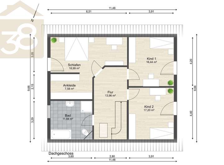 Im Obergeschoss erwartet Sie ein großzügiger Flur mit einem gemütlichen Platz für eine Leseecke unter dem Fenster. Das Schlafzimmer verfügt über einen praktischen Ankleideraum, der bereits passgenaue Ankleidemöbel beinhaltet. Das moderne Bad lässt keine Wünsche offen: Mit einer weiteren ebenerdigen Dusche, einem Doppelwaschtisch und einer Badewanne verwandelt es sich in eine Oase der Entspannung. Selbstverständlich gibt es einen Wäscheschacht, der bis zum Erdgeschoss führt. Zwei etwa gleich große Kinderzimmer bieten großzügigen Platz für die Kleinen.