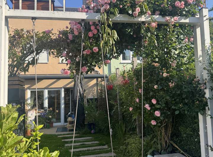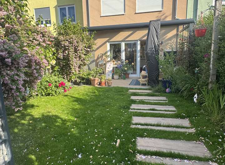 Der Garten lädt zum Verweilen und Entspannen im Grünen ein, während die überdachte Terrasse zusätzlichen Raum für gesellige Stunden im Freien bietet. Im Vorgarten befindet sich ein praktisches Gerätehaus für Gartengeräte oder Fahrräder.