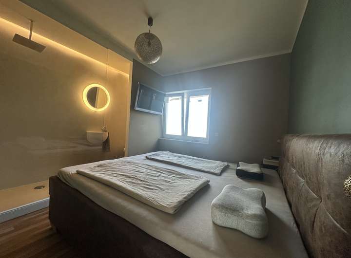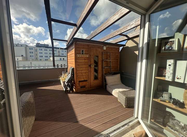 Ein besonderes Highlight ist die Dachterrasse mit integrierter Sauna, die zur privaten Entspannungsoase wird.