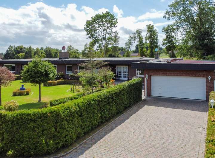 Dieses großzügige Einfamilienhaus präsentiert sich als ehemalige Unternehmervilla im eleganten Bungalowstil und bietet auf rund 300 m² Wohnfläche ein komfortables Wohnerlebnis auf einer Ebene. In ruhiger Lage einer verkehrsberuhigten Dorfstraße (30er-Zone) gelegen, genießen Sie von hier aus einen unverbaubaren Blick über die angrenzenden Felder – ein Refugium für alle, die Wert auf Ruhe und Privatsphäre legen.