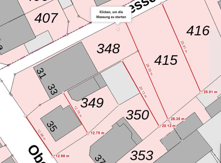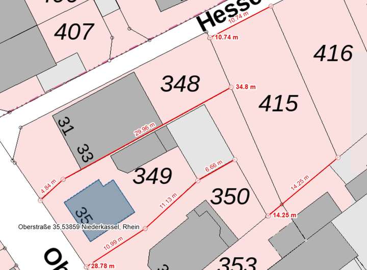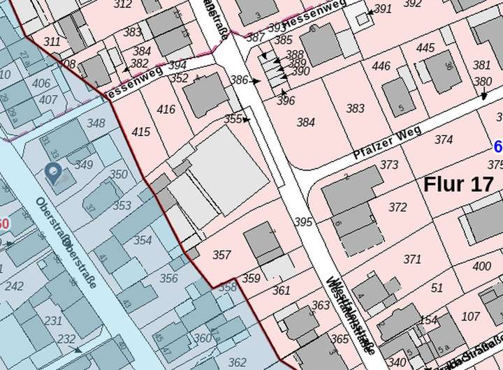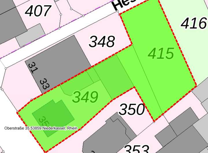 Das der Oberstraße zugewandte Flurstück 349 (423 qm) ist bebaut mit einem interessanten Einfamilienhaus (Bj 1936) mit insg. 102 qm Wohnfläche. Das zweite Flurstück (295 qm) angrenzend am Hessenweg wird derzeit als Garten genutzt, ist aber als baureifes Land ausgewiesen.
