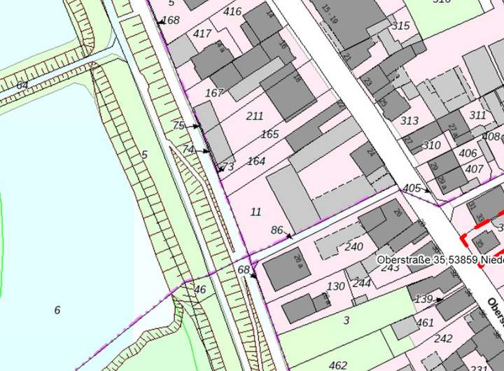 Auf dem der Oberstr. zugewandten Flurstück befinden sich ein Einfamilienhaus, ein Nebengebäude und eine große Garage