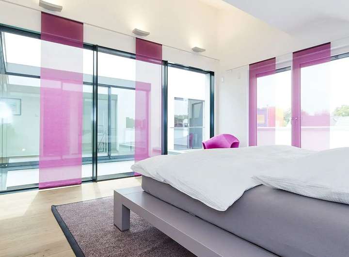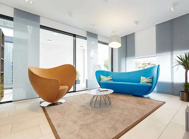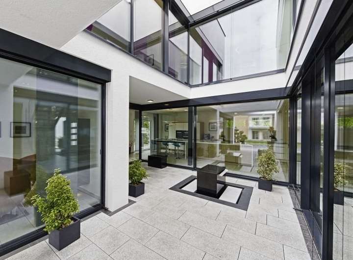 Durch die Teilung der Dachflächen entsteht das Herzstück des Hauses: das Atrium im Stile römischer Architektur. Bodentiefe Fenster und Schiebetüren verbinden drinnen mit draußen und sorgen für reichlich Lichteinfall. Hier trifft man sich gerne!
