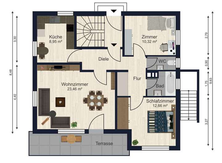 Die Erdgeschosswohnung verfügt über eine Südterasse, die direkten Zugang vom Wohn- und Schlafzimmer ermöglicht und den perfekten Ort für entspannte Stunden im Freien bietet.