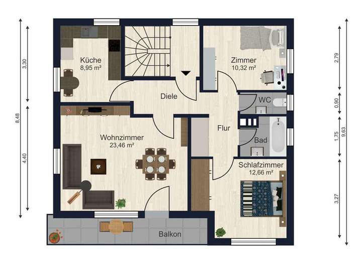 Die Obergeschosswohnung verfügt über einen Südbalkon, ebenfalls mit Zugang vom Wohn- und Schlafzimmer und ermöglicht einen wunderbaren Blick in die Umgebung.