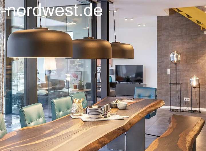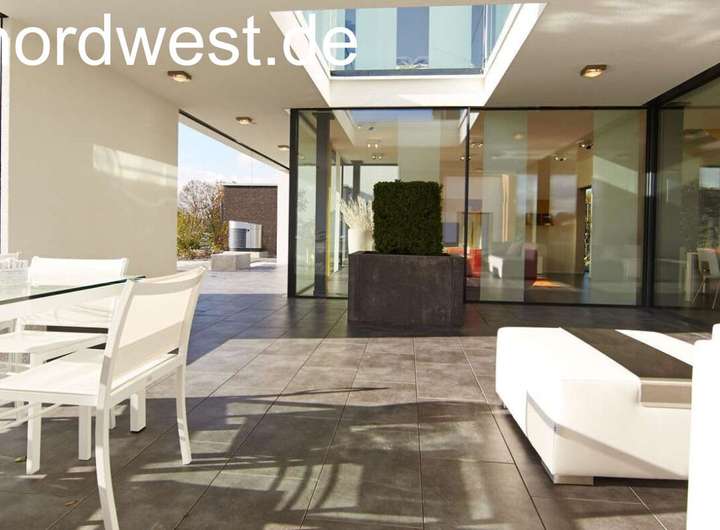 Das Terrassenhaus mit Flachdach repräsentiert Architektur der hohen Schule. Puristisch und erhaben-imposant zugleich, die klare Anlehnung an den Bauhausstil erkennbar. Die Übergänge von drinnen nach draußen verschmelzen bewusst. Der überdachte und 52 m² große Terrassen-Außenbereich erweitert den Wohnraum fließend und bietet gleichzeitig Blickschutz.