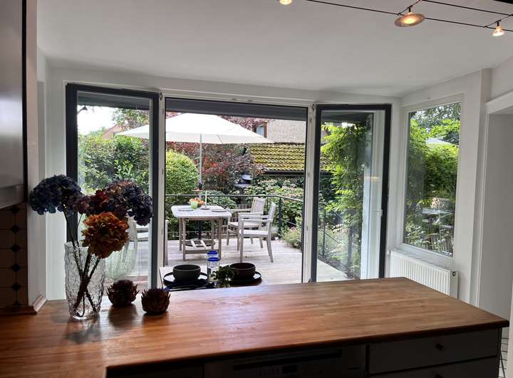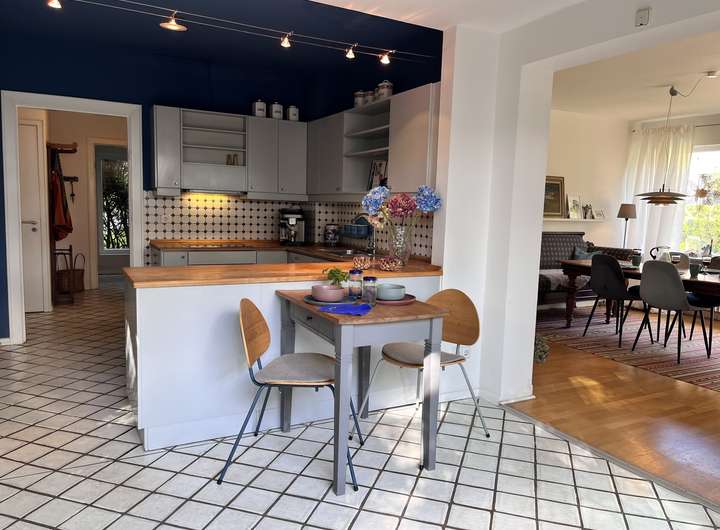 Auf ca. 129 m² Wohnfläche verteilen sich insgesamt 5 Zimmer, die viel Raum für das Familienleben und individuelle Gestaltung bieten. Im Erdgeschoss befinden sich drei helle Zimmer und ein Duschbad. Von der Diele aus rechts befindet sich das großzügige Wohnzimmer mit einem schönen Kaminofen, der vor allem im Winter eine heimelige Atmosphäre schafft. Die weiteren zwei Zimmer werden zurzeit als Ess- und Gästezimmer genutzt. Besonders hervorzuheben ist die offene Küche, die durch die große Fensterfront mit Zugang auf die Terrasse und Blick in den Garten beeindruckt. Durch diese großzügige Verglasung entsteht eine fließende Verbindung zwischen Innen- und Außenraum. Auf diese Weise wird die Küche zum Mittelpunkt des Familienalltags – ideal für gemeinsames Kochen und genießen der Mahlzeiten drinnen oder im Freien.