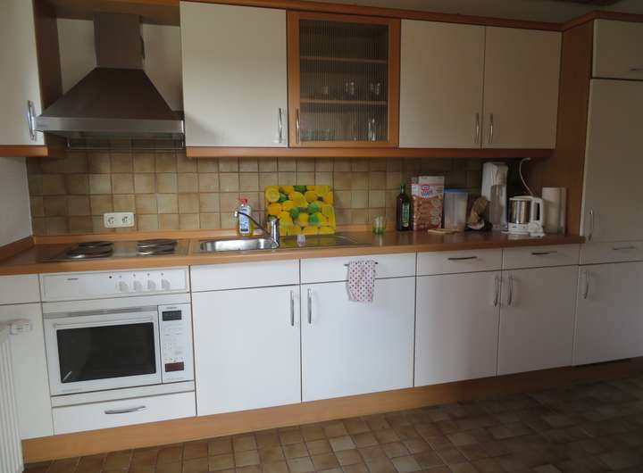 1 Flur, 1 Einbauküche offen zum Wohnzimmer, 1 Schlafzimmer, 1 Bad mit Wanne, Dusche, Waschbecken und WC.
